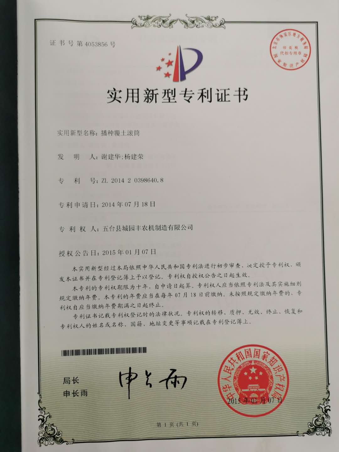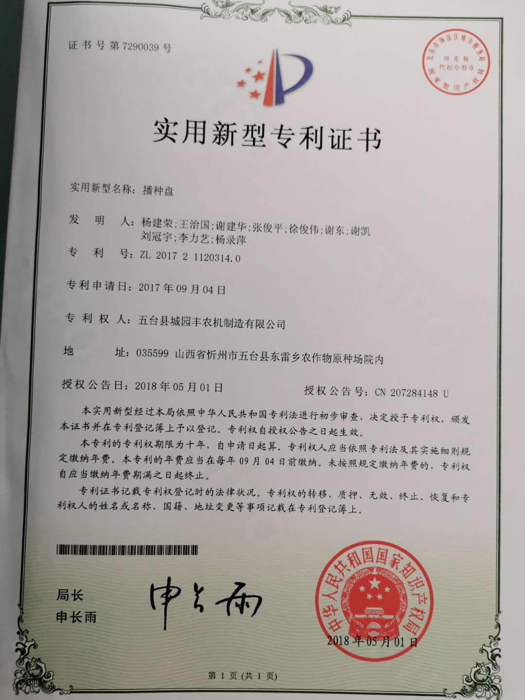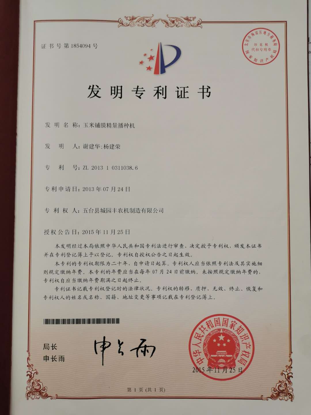 公司的主要產(chǎn)品玉米鋪膜精量播種機的研發(fā)制造推廣獲得了2013年忻州市科學(xué)技術(shù)進步獎、一項發(fā)明專利及5項實用新型專利等。