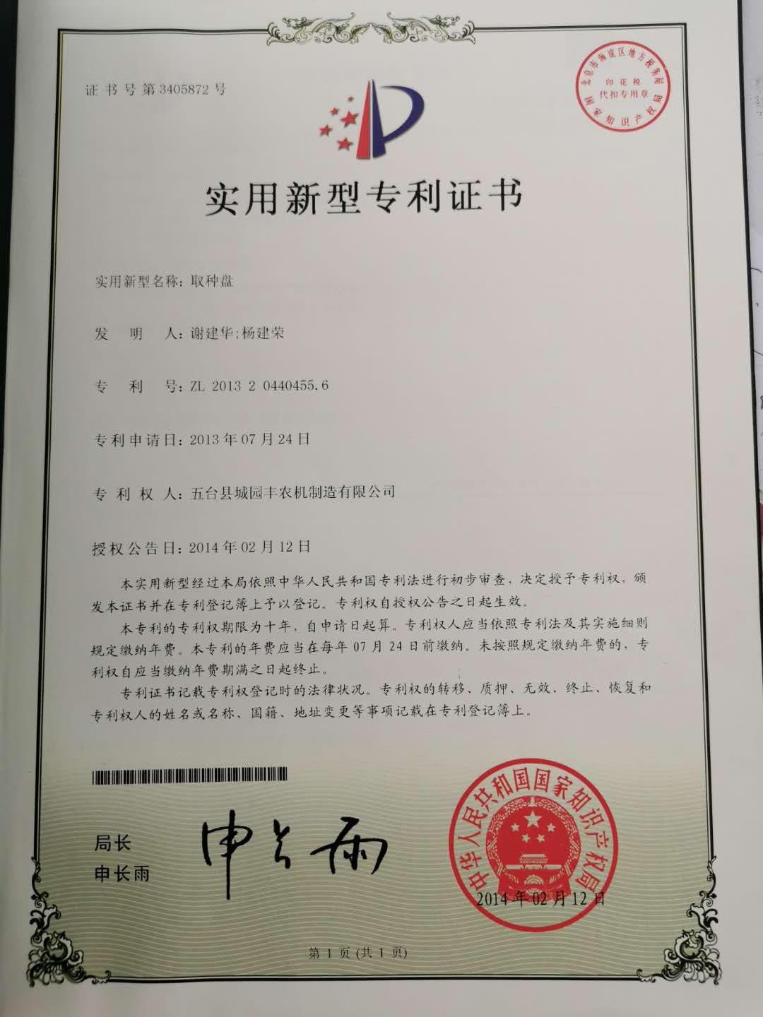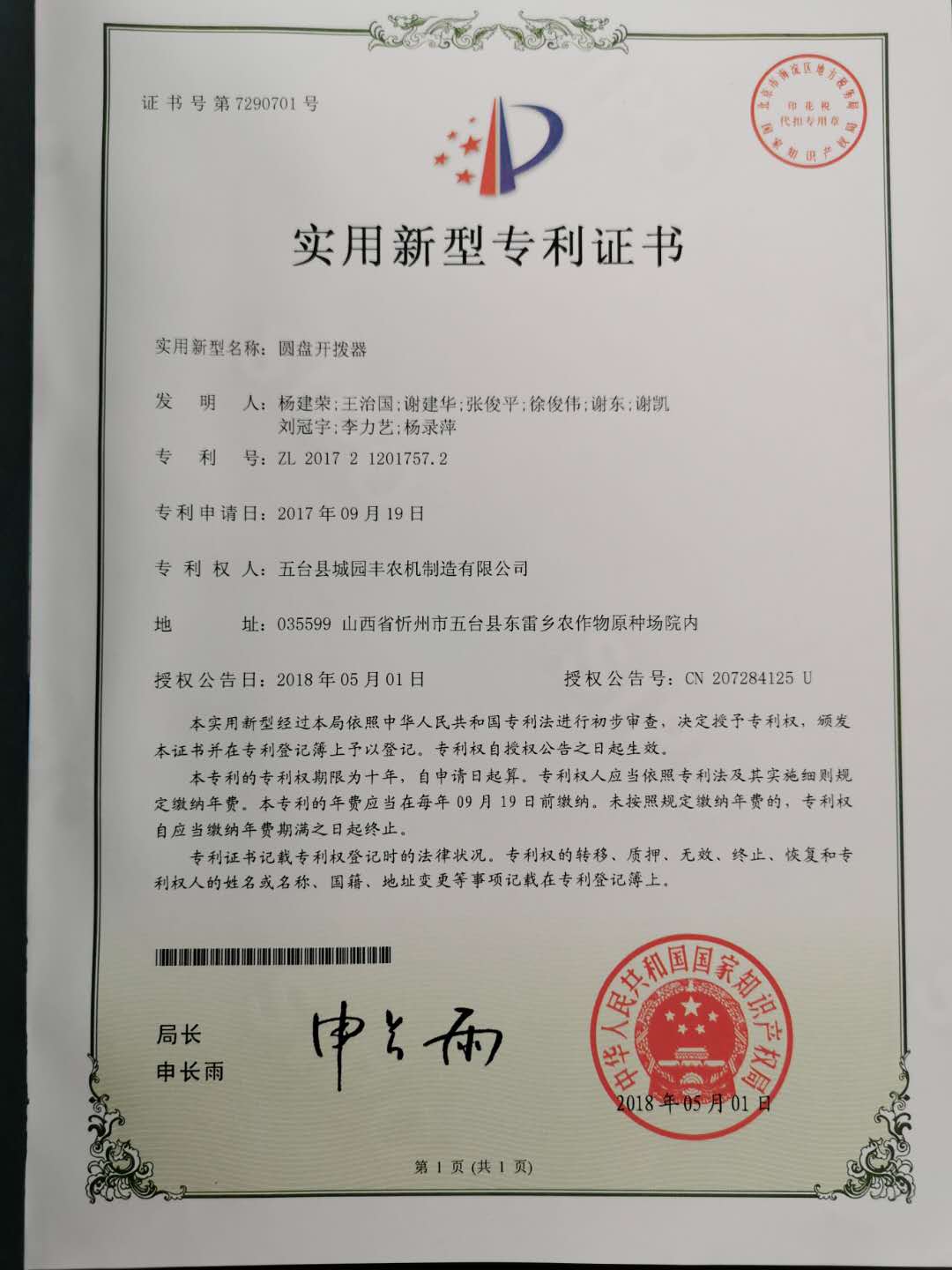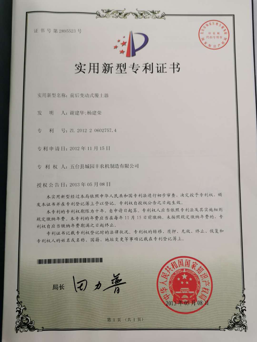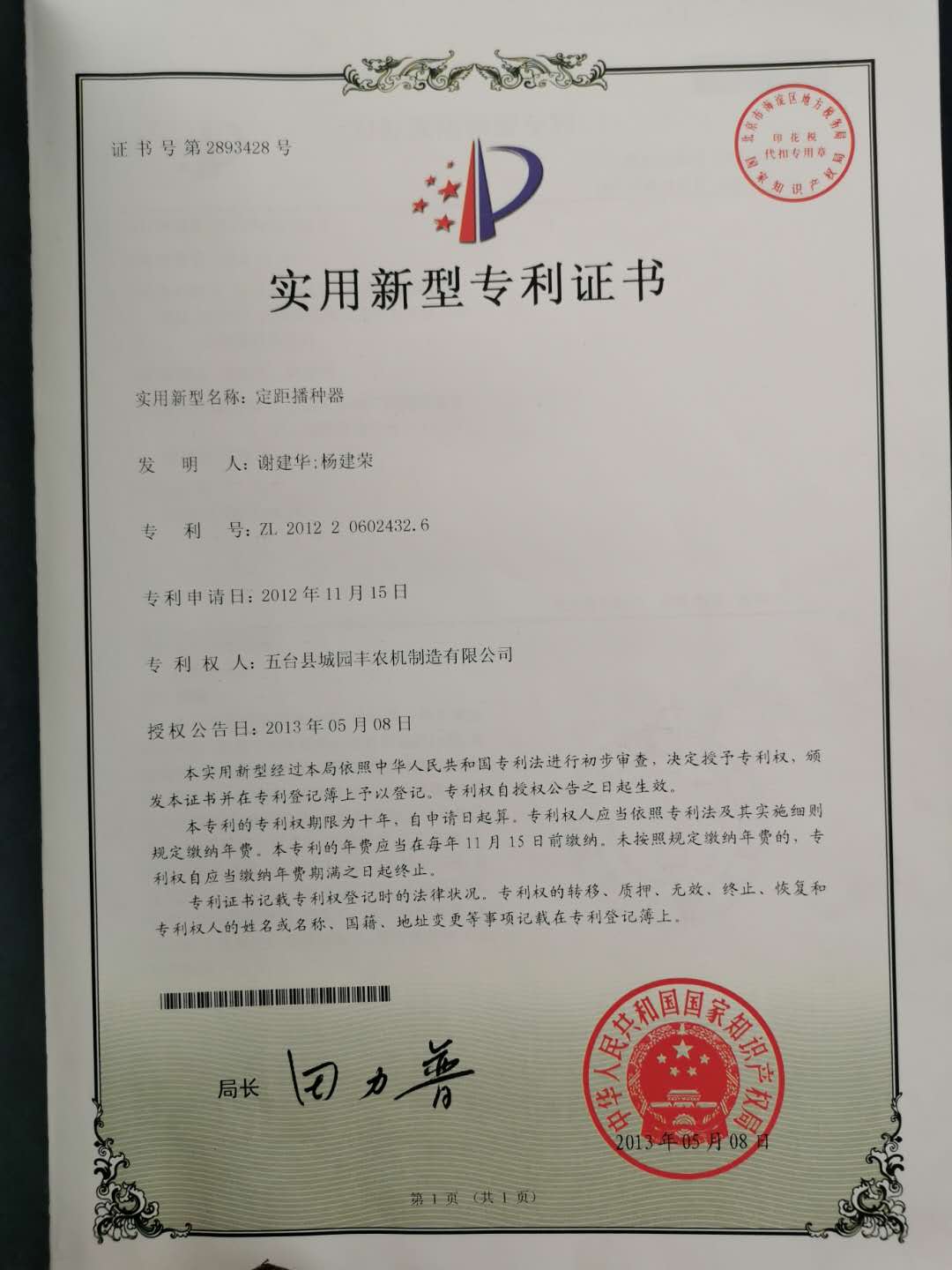 公司的主要產(chǎn)品玉米鋪膜精量播種機的研發(fā)制造推廣獲得了2013年忻州市科學(xué)技術(shù)進步獎、一項發(fā)明專利及5項實用新型專利等。