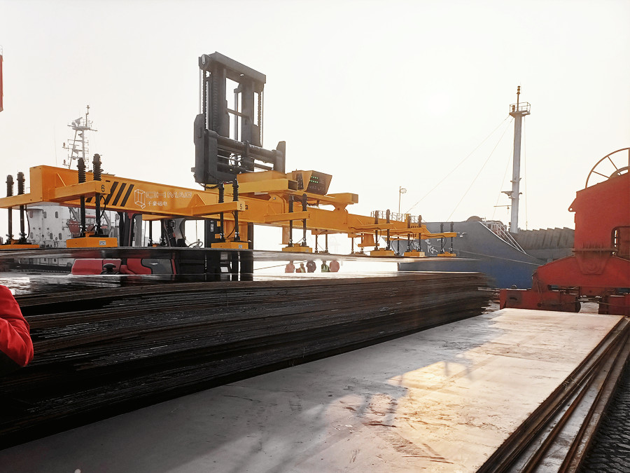 此款磁力吊具用在港口配合叉車使用吊運長鋼板。本套充電式鋼板起重吊具采用12組電永磁起重器聯(lián)吊??蓪崿F(xiàn)單張鋼板max重量為4噸、厚度8mm、10mm、12mm鋼板一次搬運二張平穩(wěn)運行。厚度14mm、16mm鋼板一次搬運一張平穩(wěn)運行。